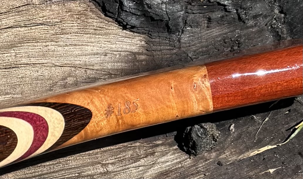 Has a Maple Burl – Blood Wood handle that is 7-1/2” long. The hoop is Wenge, Curly Maple and Purple Heart. It measures 16” by 8” and is 14” in depth.